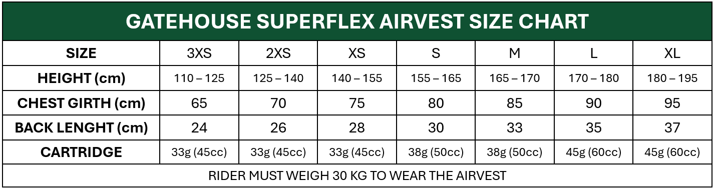 The design and fit of the Gatehouse Superflex Air vest ensure that it does not get in the way while riding, while still providing the necessary protection when inflated. We have drawn on our decades of experience, including at the highest level of international competition, to develop a garment that gives riders of virtually any height, from children to adults, a feeling of reassurance. Exactly what you would expect from the Gatehouse brand!
